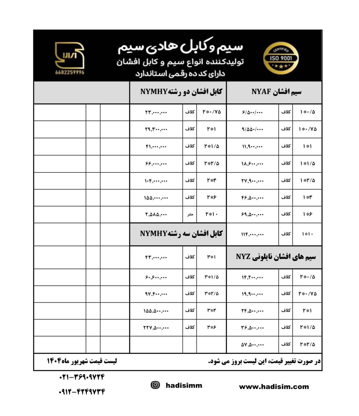 در ابتدای این مطلب ما تمامی قیمت های سیم و کابل از برند های سیم پود و هادی سیم را درج کردیم تا شما بتوانید با مشاهده و دانلود آنها، جدید ترین قیمت ها را داشته باشید. اگر بخواهیم قیمت های برند های هادی سیم و سیمپود را نسبت به سایر برند ها مانند خراسان افشار نژاد، راد افشان سحر، البرز، همدان، مسینا و … مقایسه کنیم، باتوجه به حفظ کیفیت رقابتی، قیمت بسیار ارزانتری خواهند داشت.